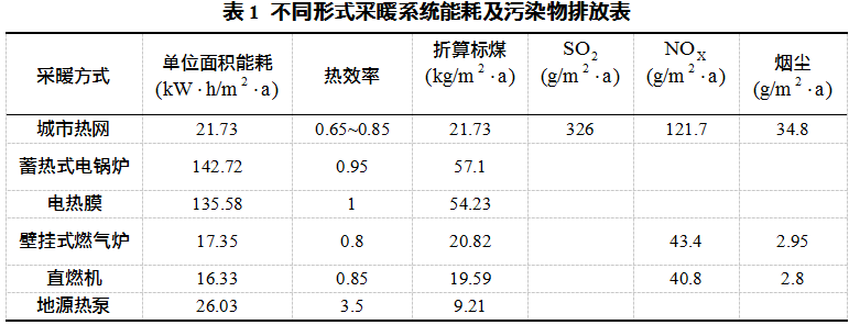 不同形式系統采暖能耗及污染物排放比較如表1所示。
