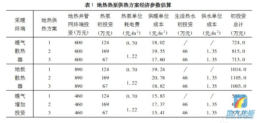 表1列出了不同采暖終端,新鉆地熱井系統的投資和單位運行成本的計算結果。從三種地熱供熱方案看,方案1的投資低,供暖成本也低,但沒有生活熱水供應。綜合比較,方案3既有供暖,又有生活熱水供應,同時還兼顧夏季空調,運行成本最低,投資費用處在方案1和方案2之間,可作為優選方案。