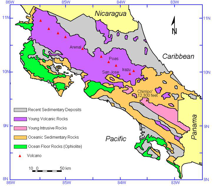 哥斯達黎加位于中美洲地峽,屬于北美洲,北緯10°,西經84°。東臨加勒比海西靠北太平洋,有著1290千米有著1290千米的海岸線(東岸加勒比海212千米,西岸太平洋1016千米)。哥斯達黎加北部與尼加拉瓜接壤(邊境線長309千米),東南偏南與巴拿馬接壤(邊境線長639千米)??偣灿?1100平方公里,其中領土50660平方公里,領海440平方公里,比美國的西弗吉尼亞州稍小,相當于愛爾蘭。森林覆蓋率為51%。哥斯達黎加的地形是:海岸邊是平原,而中部被崎嶇的高山所隔絕。該國宣布其專屬經濟區為200海里,領海為12海里。氣候屬于熱帶和亞熱帶,還有一部分是新熱帶。