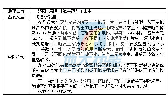 河南省欒川九龍山溫泉風景九龍山溫泉時流量56噸,常年恒溫69.5℃,內含鉀、鈉、鈣、鎂、鋰、鍶、碳酸根等27種有益元素,另外含有鈾、氡兩種弱放射性元素,為氟硅復合型醫療礦泉水,對風濕、類風濕、肩周炎、關節炎、肌肉勞損等疾病有很好療效,對皮膚病、婦科病有特效。因該泉水質優、流量大、溫度高被稱為中原第一泉,因其醫療效果顯著,被民間譽為九龍神泉。