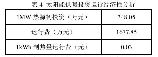 根據(jù)《太陽能供熱供暖工程技術(shù)規(guī)范》 (GB50495-2019),在寒冷地區(qū)太陽能供暖系統(tǒng)須采用間接供暖系統(tǒng)。太陽能間接供暖系統(tǒng)用于集中供暖熱源投資運行經(jīng)濟性分析詳見表4: