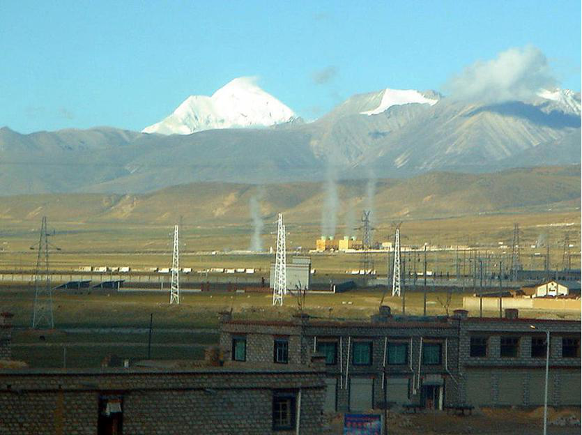 羊八井,即羊八井鎮(zhèn),位于西藏拉薩市西北91.8公里的當(dāng)雄縣境內(nèi)。熱田地勢(shì)平坦,海拔4300米,南北兩側(cè)的山峰均在海拔5500~6000米以上,山峰發(fā)育著現(xiàn)代冰川,藏布曲河流經(jīng)熱田,河水溫度年平均為5℃,當(dāng)?shù)啬昶骄鶜鉁?.5℃,大氣壓力年平均為0.06兆。附近一帶經(jīng)濟(jì)以牧業(yè)為主,兼有少量農(nóng)業(yè)。青藏、中尼兩條公路干線分別從熱田的東部和北部通過(guò),交通尚為方便。
