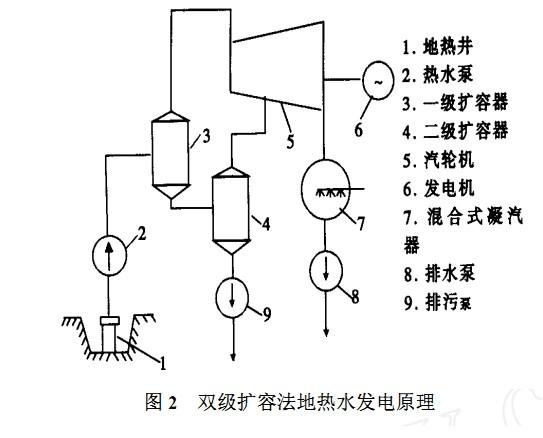 西南電力設(shè)計(jì)院設(shè)計(jì)的羊八井地?zé)?/a>電站第1臺(tái)試驗(yàn)機(jī)組,容量為1000kW,汽輪機(jī)是利用四川內(nèi)江電廠2500kW廢棄設(shè)備改造而成。于1977年10月試運(yùn)成功,采用單級(jí)擴(kuò)容法熱力系統(tǒng)。若把地?zé)崴?/a>送入1個(gè)密閉的容器中降壓、擴(kuò)容,根據(jù)水沸點(diǎn)與壓力的關(guān)系,可使溫度不太高的地?zé)?/a>水因氣壓降低而沸騰變成蒸汽。由于地?zé)?/a>水降壓蒸發(fā)的速度很快,是一種閃急蒸發(fā)過(guò)程;同時(shí),地?zé)崴?/a>蒸發(fā)產(chǎn)生蒸汽時(shí),其體積迅速擴(kuò)大,所以該容器稱為“擴(kuò)容器”或“閃蒸器”。用這種方法產(chǎn)生蒸汽來(lái)發(fā)電稱為擴(kuò)容法地?zé)崴?/a>發(fā)電。這是利用地?zé)崽?/a>熱水發(fā)電的主要方式之一,該方式分單級(jí)擴(kuò)容法系統(tǒng)和雙級(jí)(或多級(jí))擴(kuò)容法系統(tǒng)。擴(kuò)容法系統(tǒng)的原理是:將地?zé)峋?/a>來(lái)的中溫地?zé)?/a>汽、水混合物,先送到擴(kuò)容器中進(jìn)行降壓、擴(kuò)容(稱閃蒸),使其產(chǎn)生部分蒸汽,蒸汽經(jīng)過(guò)分離器除去雜質(zhì)(10μm及以上)后,再引到常規(guī)汽輪機(jī)機(jī)發(fā)電。