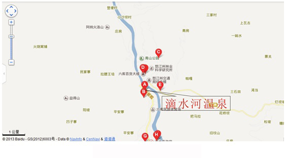 云南滴水河溫泉風景滴水河溫泉以泉群形式出露,出水點散布于滴水河河床及河漫灘上,地表為第四系礫石、砂等沖洪積物覆蓋,滴水河溫泉出露特征高程與躍進橋溫泉和瑪布河溫泉不同,其出露高程為1502.3m,相對較高。